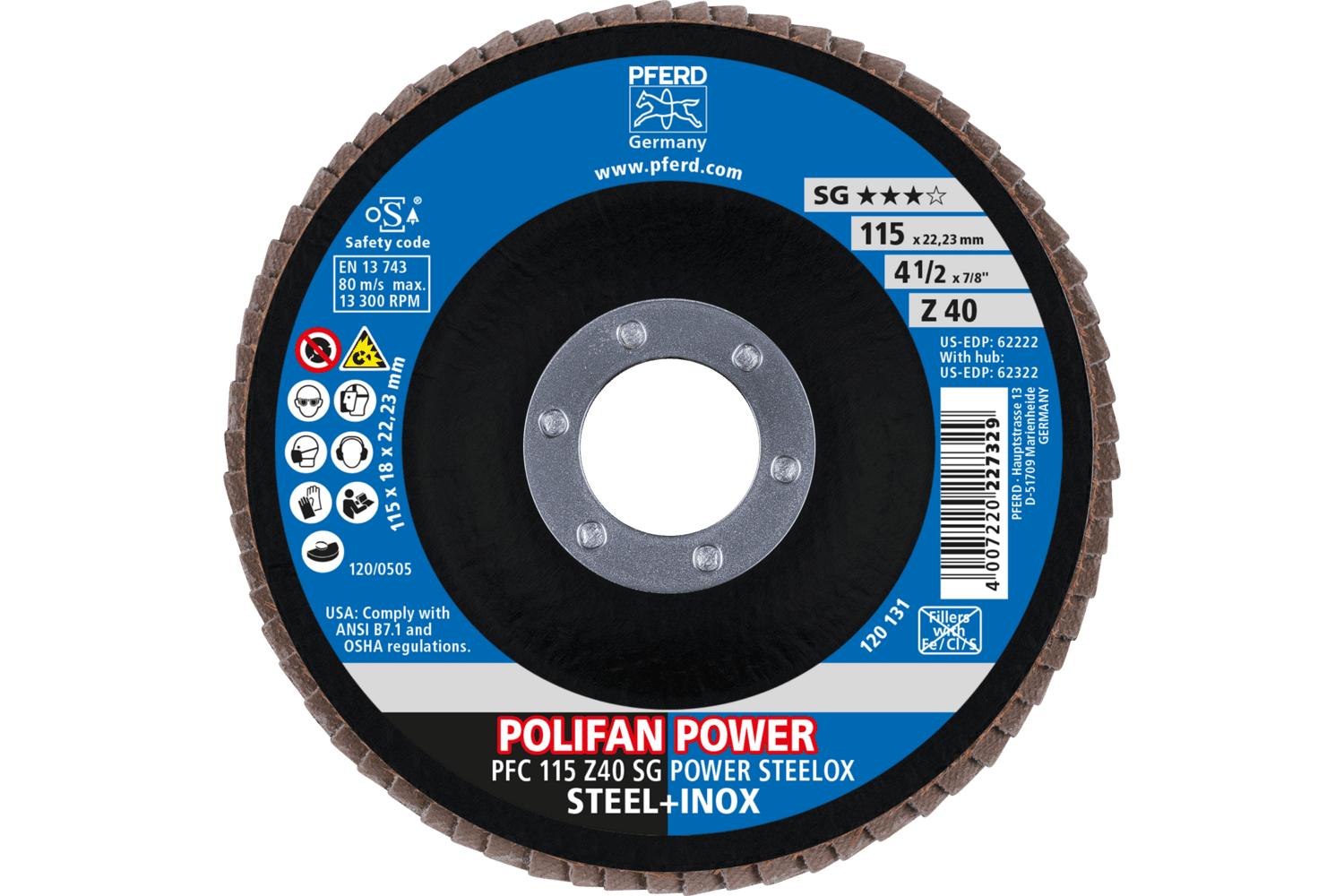 PFERD Polifan® Coated Abrasive Flap Disc, Unthreaded, Series: Performance Line SG Z-Power, 4-1/2 in Disc Dia, 7/8 in Center Hole, 40 Grit, Zirconia Alumina Abrasive, Type 29 Conical Disc, Cloth Backing, 13300 rpm Maximum