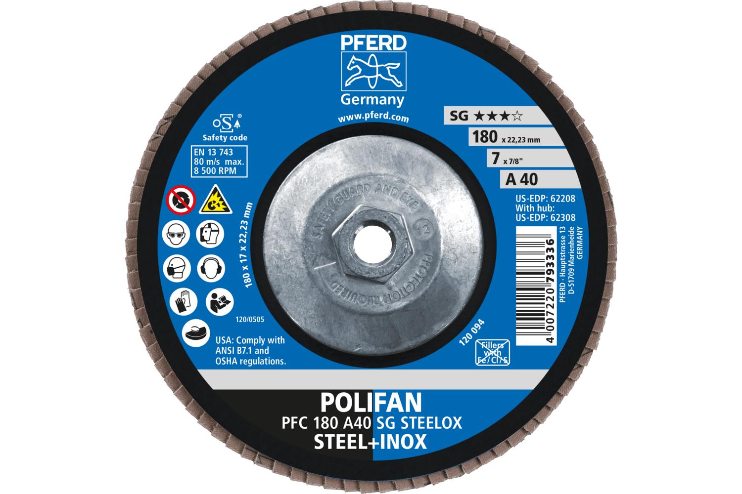 PFERD Polifan® Coated Abrasive Flap Disc, Threaded, Series: Performance Line SG A, 7 in Disc Dia, 5/8-11 Center Hole Thread Size, 40 Grit, Aluminum Oxide Abrasive, Type 29 Conical Disc, Cloth Backing, 8500 rpm Maximum