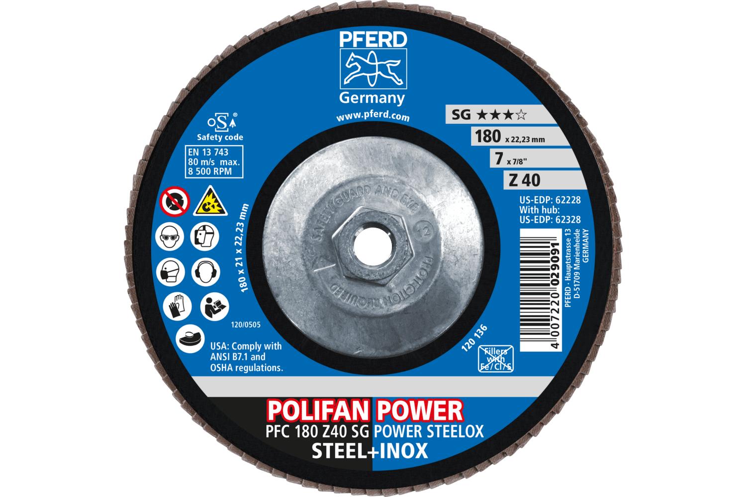 PFERD Polifan® Coated Abrasive Flap Disc, Threaded, Series: Performance Line SG Z-Power, 7 in Disc Dia, 5/8-11 Center Hole Thread Size, 40 Grit, Zirconia Alumina Abrasive, Type 29 Conical Disc, Cloth Backing, 8500 rpm Maximum