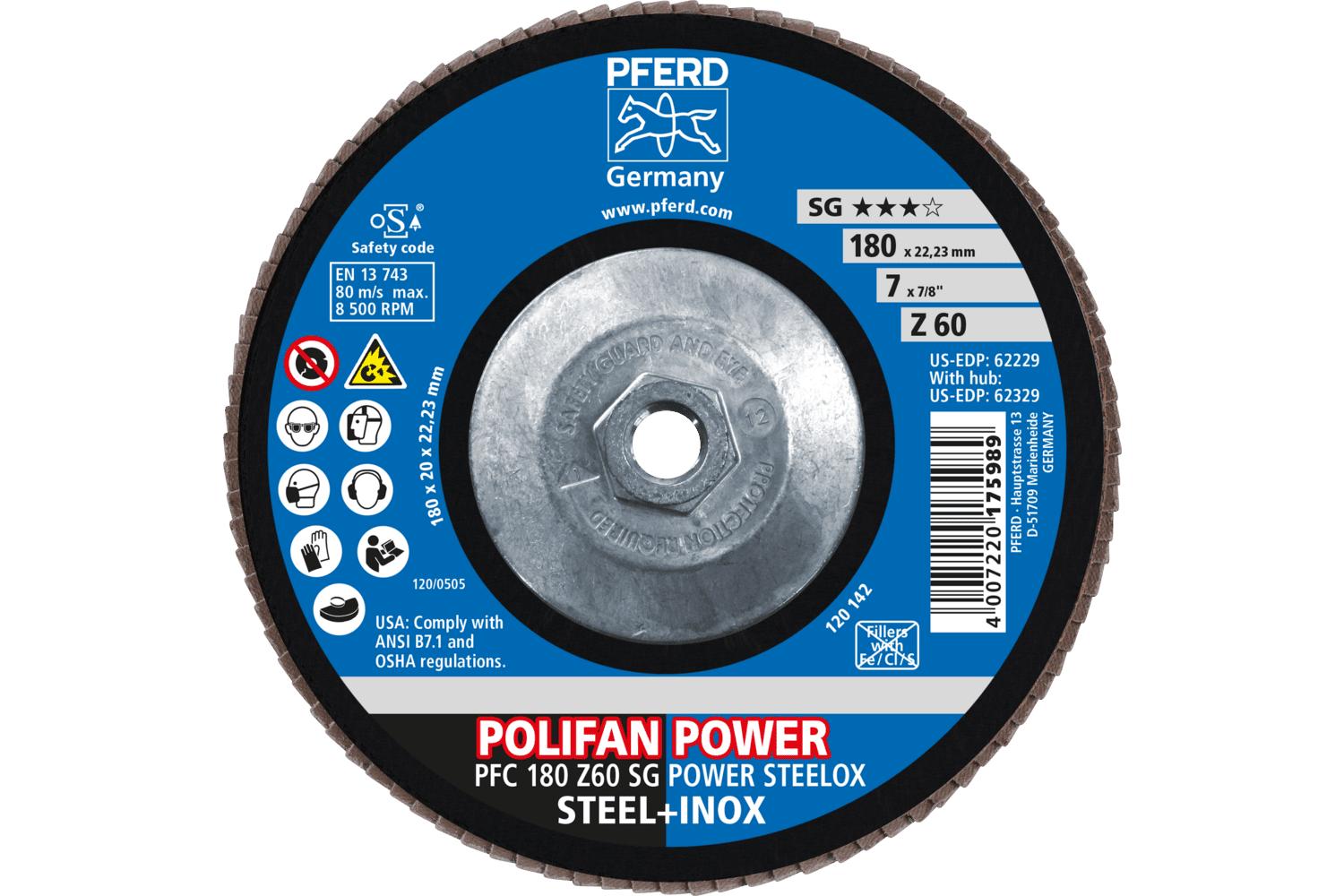 PFERD Polifan® Coated Abrasive Flap Disc, Threaded, Series: Performance Line SG Z-Power, 7 in Disc Dia, 5/8-11 Center Hole Thread Size, 60 Grit, Zirconia Alumina Abrasive, Type 29 Conical Disc, Cloth Backing, 8600 rpm Maximum