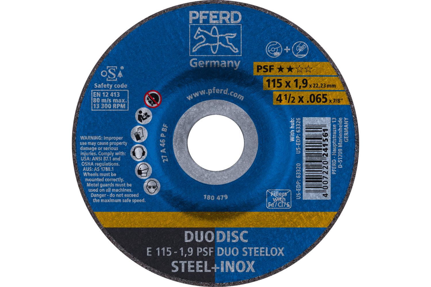 - Abrasive Material:Aluminum OxideApplicable Materials:Stainless Steel (INOX) and SteelCenter Hole Size:7/8 inGrade:MediumGrit:46Maximum Speed:13300 rpmSeries:Universal Line PS-FORTESuitable For Use With:Angle GrindersType:Depressed CenterWheel Diameter:4-1/2 inWheel Hardness:PWheel Thickness:0.065 inWheel Type Number:Type 27