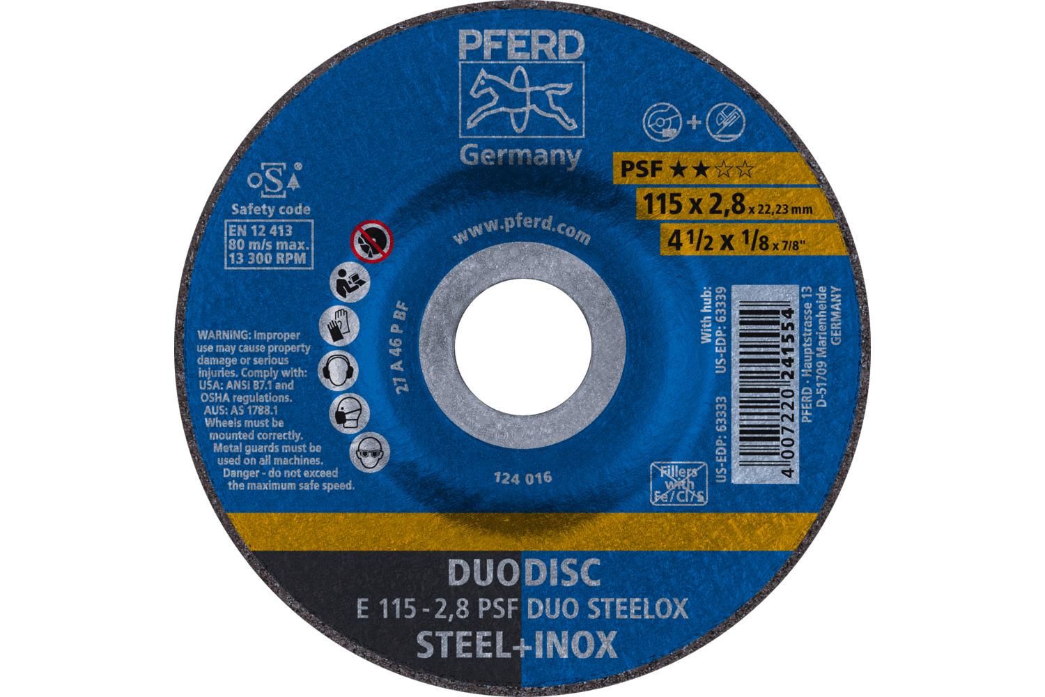 - Abrasive Material:Aluminum OxideApplicable Materials:Stainless Steel (INOX) and SteelCenter Hole Size:7/8 inGrade:MediumGrit:46Maximum Speed:13300 rpmSeries:Universal Line PS-FORTESuitable For Use With:Angle GrindersType:Depressed CenterWheel Diameter:4-1/2 inWheel Hardness:PWheel Thickness:1/8 inWheel Type Number:Type 27