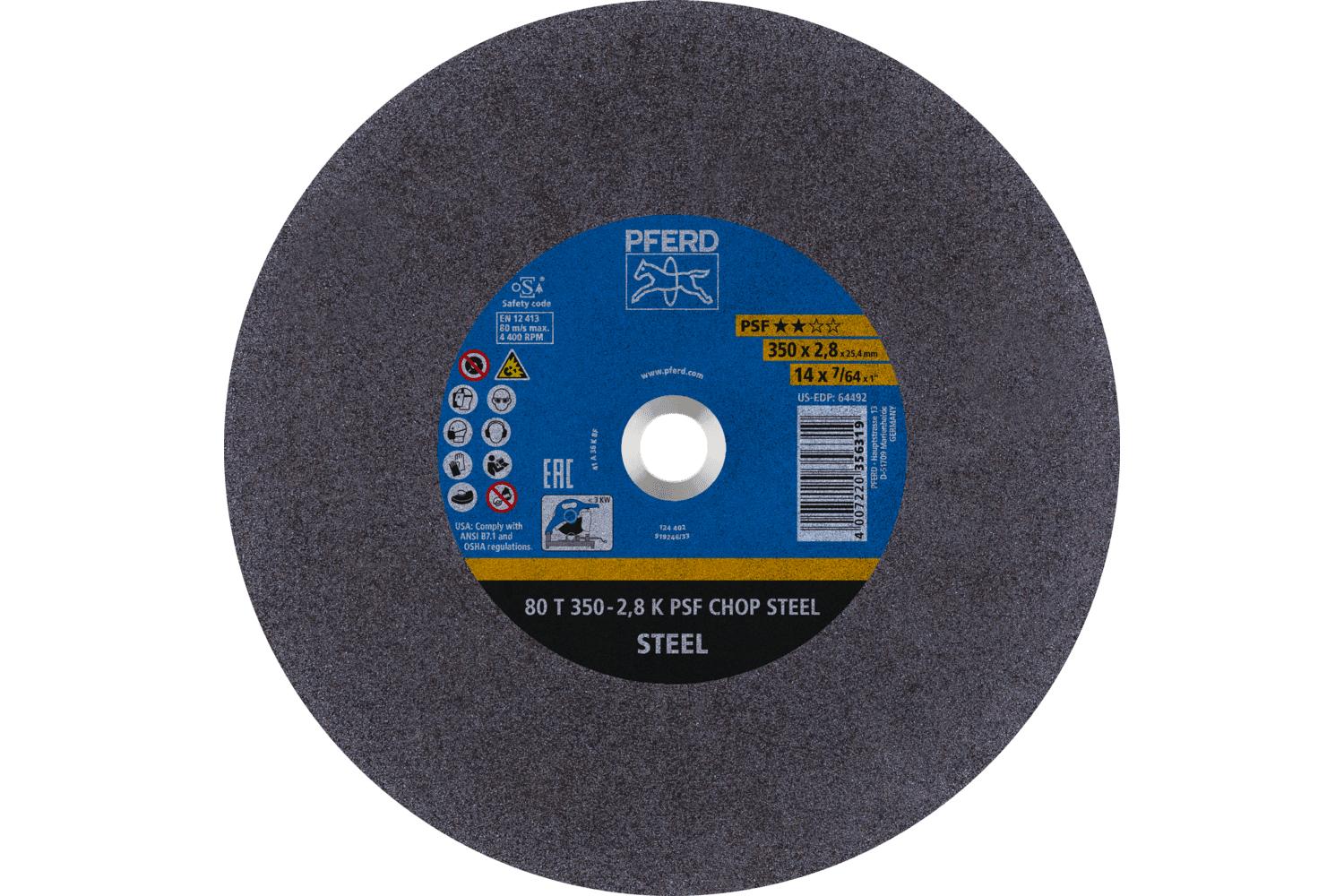 PFERD Cut-Off Wheel, Type 1, Series: Universal Line PS-FORTE, 14 in Wheel Dia, 3/32 in Wheel Thickness, 1 in Center Hole, 36 Grit, Extra Coarse Grade, Aluminum Oxide Abrasive, 4400 rpm Maximum, Applicable Materials: Steel, Wheel Type Number: Type 1, Wheel Hardness: K, For Use With: Portable Chopsaws, Yes Reinforced