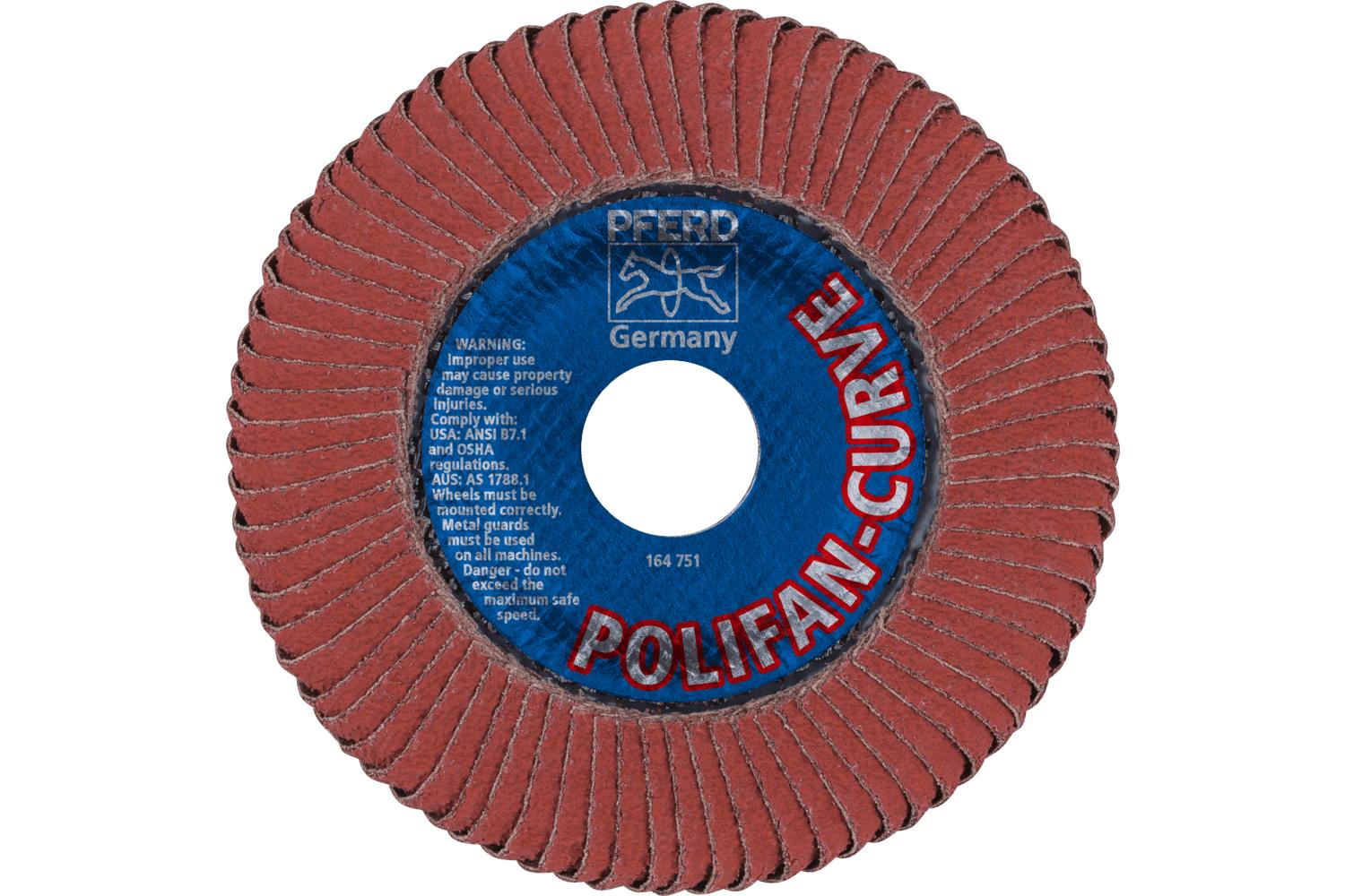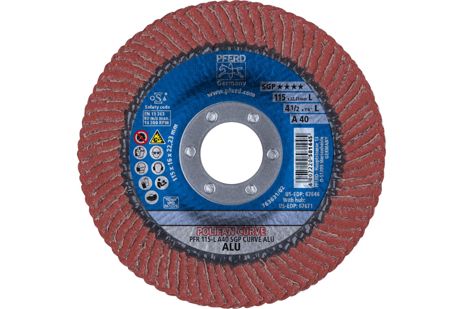 PFERD Polifan® Coated Abrasive Flap Disc, Unthreaded, Series: Special Line SGP-PLUS CURVE-ALU, 4-1/2 in Disc Dia, 7/8 in Center Hole, 40 Grit, Topsized Aluminum Oxide Abrasive, Type PFR/Radial Disc, X-Weight Fiberglass Backing, 13300 rpm Maximum