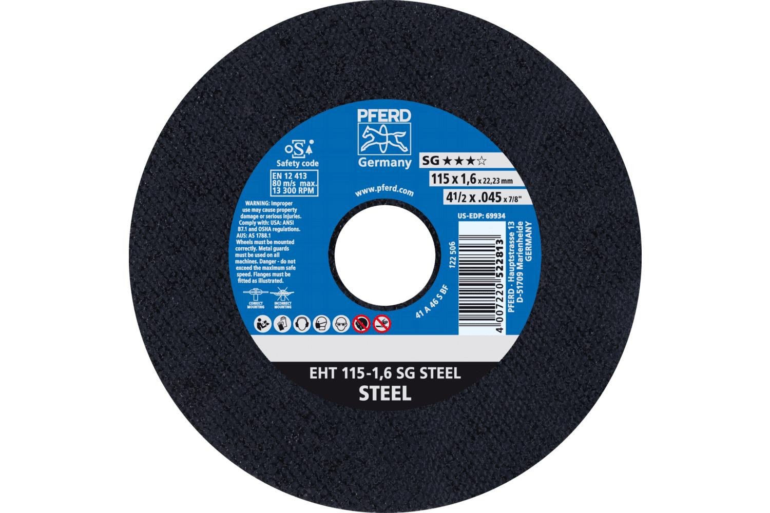 PFERD Cut-Off Wheel, Flat, Series: Performance Line SG-ELASTIC, 4-1/2 in Wheel Dia, 0.045 in Wheel Thickness, 7/8 in Center Hole, 60 Grit, Very Fine Grade, Aluminum Oxide Abrasive, 13300 rpm Maximum, Resin Bond, Applicable Materials: Stainless Steel (INOX), Carbon Steel and Ferrous Metal, Wheel Type Number: Type 1, Wheel Hardness: S, For Use With: Angle Grinders