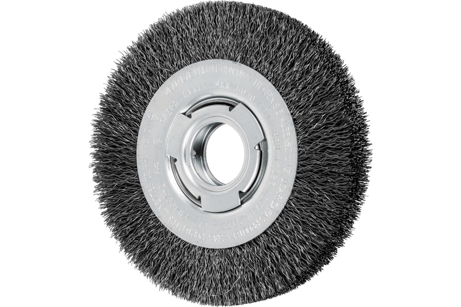 - Arbor Hole Size:2 inAttachment Type:Unthreaded ArborBrush Diameter:6 inFace Width:1-1/16 inFilament/Wire Diameter:0.014 inFilament/Wire Type:CrimpedFill Material:Carbon SteelMaximum Speed:6000 rpmTrim Length:1-1/8 inType:Medium Face