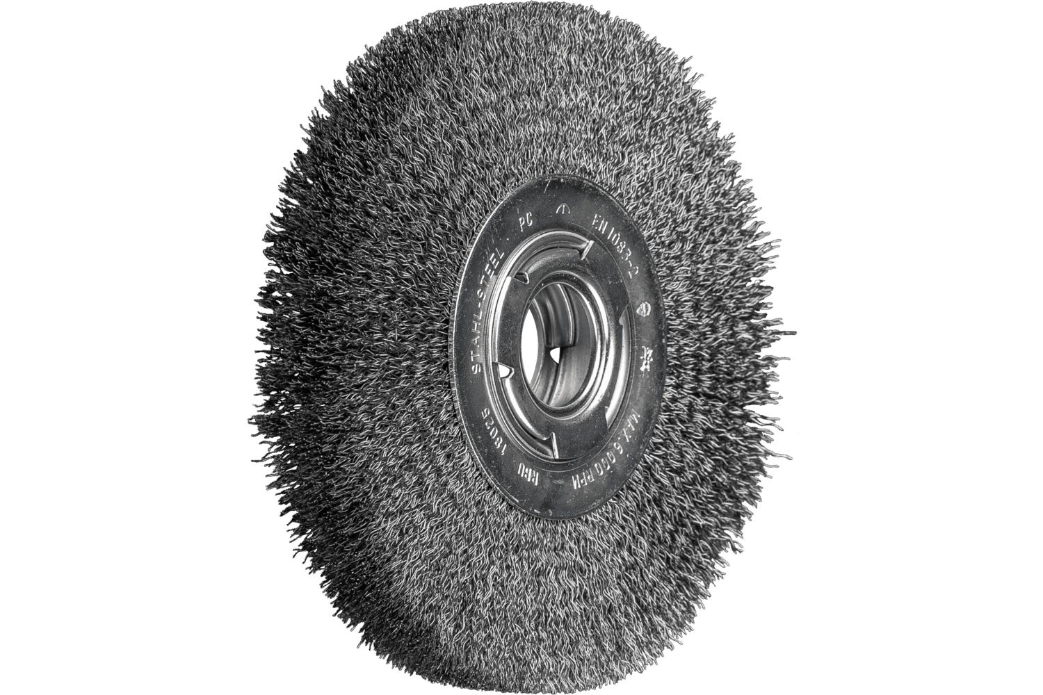 PFERD Wheel Brush, Medium Face, 7 in Brush Dia, 31/32 in Face Width, 2 in Arbor Hole Size, Crimped Filament/Wire Type, 0.012 in Filament/Wire Diameter, Carbon Steel Fill, 1-5/16 in Trim Length, 6000 rpm Maximum, Unthreaded Arbor Attachment