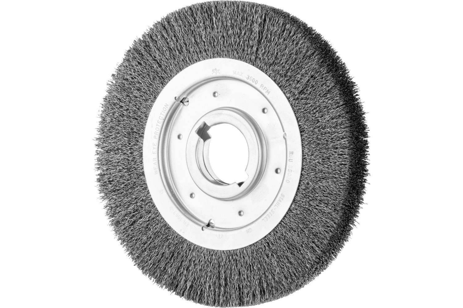 PFERD Wheel Brush, Medium Face, 10 in Brush Dia, 1-1/4 in Face Width, 2 in Arbor Hole Size, Crimped Filament/Wire Type, 0.012 in Filament/Wire Diameter, Carbon Steel Fill, 1-7/8 in Trim Length, 3600 rpm Maximum, Unthreaded Arbor Attachment