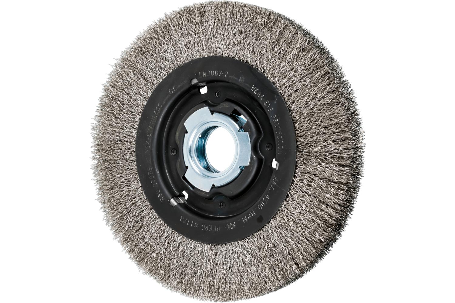 - Arbor Hole Size:2 inAttachment Type:Unthreaded ArborBrush Diameter:8 inFace Width:1-1/16 inFilament/Wire Diameter:0.014 inFilament/Wire Type:CrimpedFill Material:Stainless SteelMaximum Speed:4500 rpmTrim Length:1-1/2 inType:Medium Face