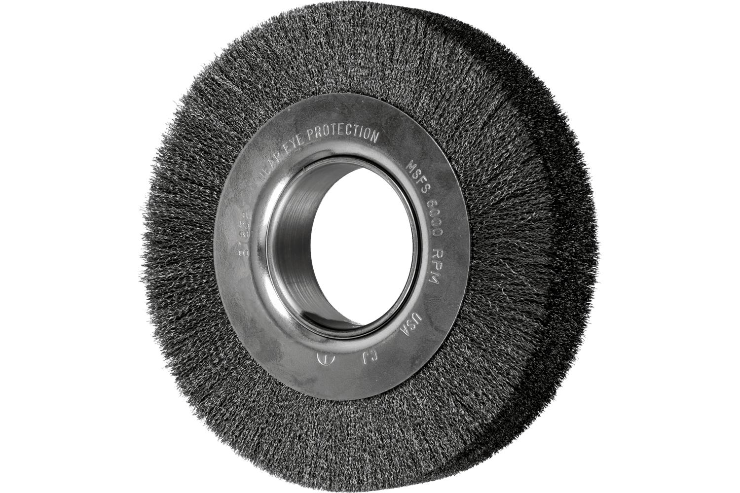 PFERD Wheel Brush, Wide Face, 6 in Brush Dia, 1-1/8 in Face Width, 2 in Arbor Hole Size, Crimped Filament/Wire Type, 0.006 in Filament/Wire Diameter, Carbon Steel Fill, 1-1/8 in Trim Length, 6000 rpm Maximum, Unthreaded Arbor Attachment