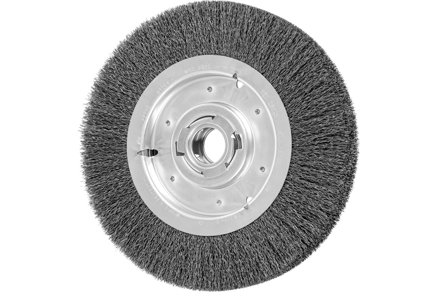 PFERD Wheel Brush, Wide Face, 10 in Brush Dia, 2-1/8 in Face Width, 2 in Arbor Hole Size, Crimped Filament/Wire Type, 0.014 in Filament/Wire Diameter, Carbon Steel Fill, 1-7/8 in Trim Length, 3600 rpm Maximum, Unthreaded Arbor Attachment