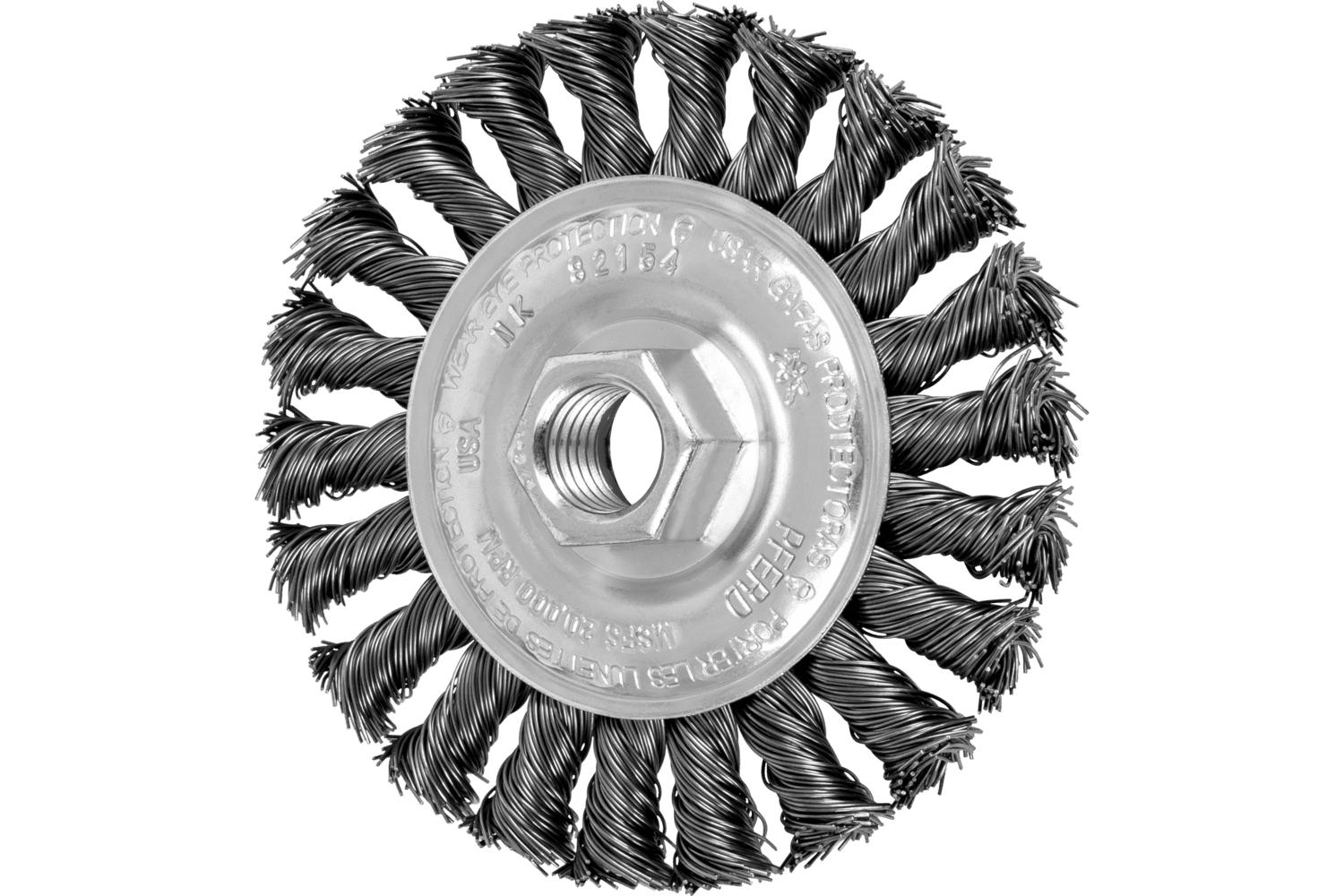 PFERD Wheel Brush, 4 in Brush Dia, 5/8 in Face Width, 5/8-11 Arbor Hole Size, Standard/Twist Knot Filament/Wire Type, 0.02 in Filament/Wire Diameter, Carbon Steel Fill, 7/8 in Trim Length, 20000 rpm Maximum, Threaded Arbor Attachment