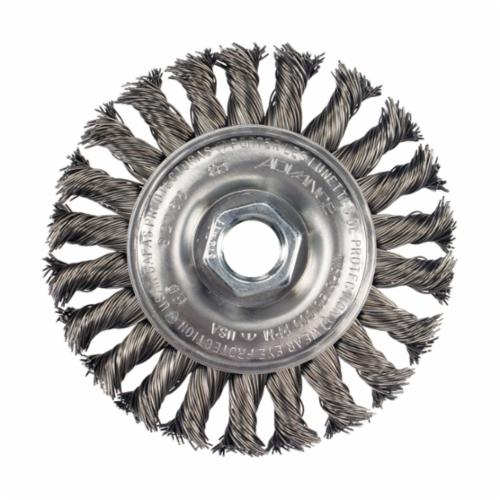 "PFERD 82168 Narrow Face Wheel Brush, 4 in Dia Brush, 3/8 in W Face, 0.02 in Dia Full Cable Twist Knot Filament/Wire, 1/2-13 Arbor Hole"
