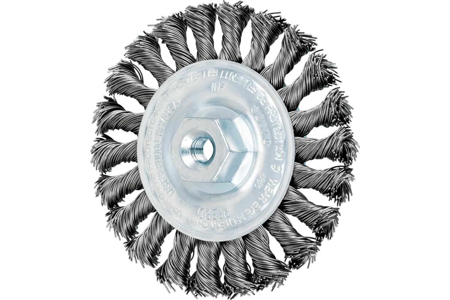 - Arbor Hole Size:3/8-24Attachment Type:Threaded ArborBrush Diameter:4 inFace Width:3/8 inFilament/Wire Diameter:0.02 inFilament/Wire Type:Full Cable Twist KnotFill Material:Carbon SteelMaximum Speed:20000 rpmTrim Length:3/4 inType:Narrow Face