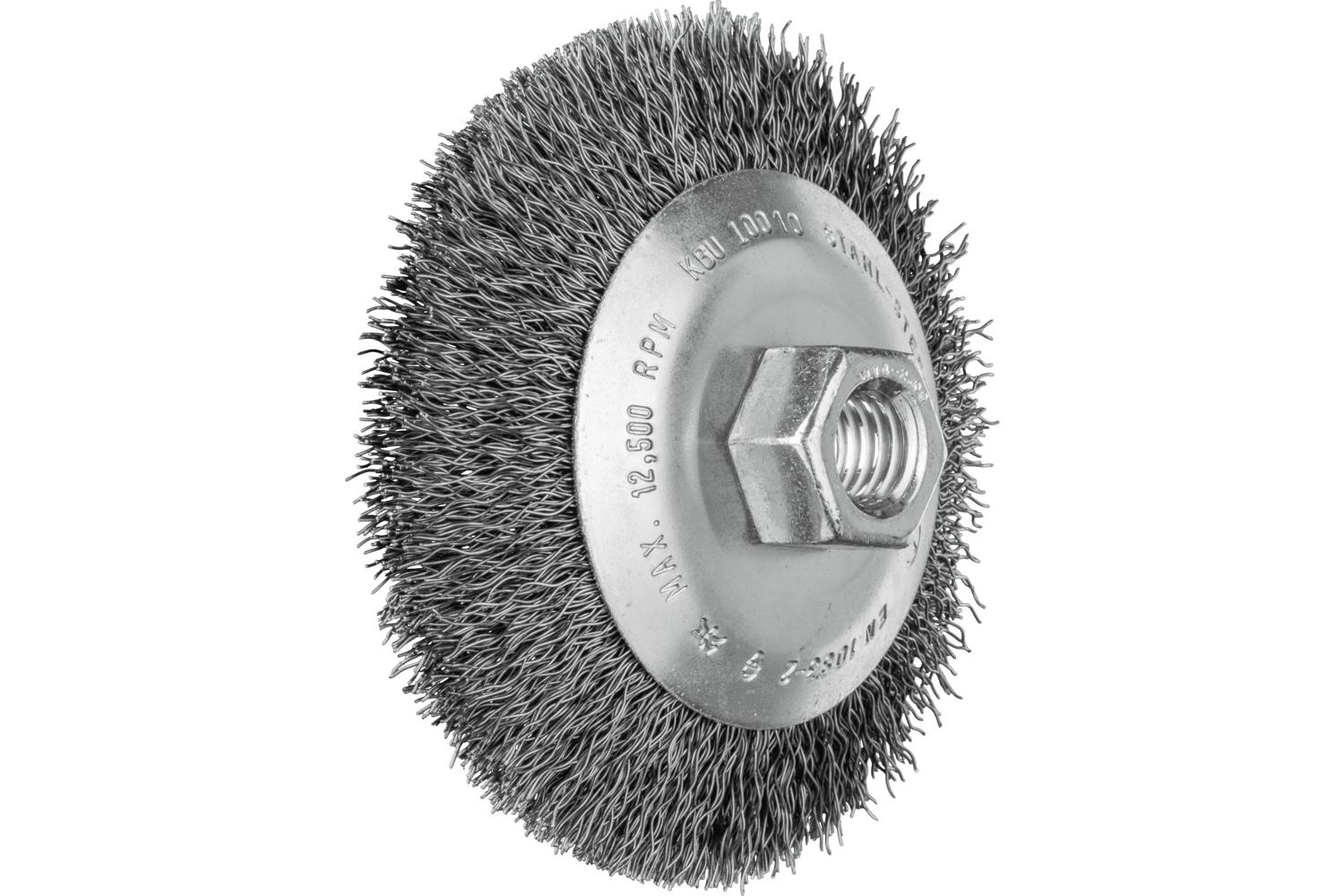 PFERD Cup Brush, Bevel Minigrinder, 4 in Brush Dia, 5/8-11 Arbor Hole Size, Crimped Filament/Wire Type, 0.014 in Filament/Wire Diameter, Carbon Steel Fill, 3/4 in Trim Length, 15000 rpm Maximum
