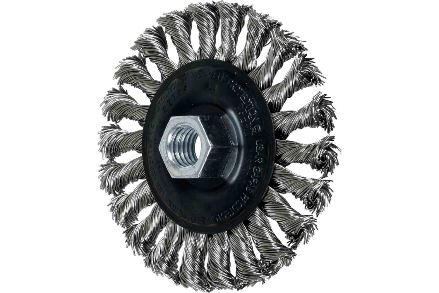 PFERD Wheel Brush, 4 in Brush Dia, 5/8 in Face Width, 5/8-11 Arbor Hole Size, Standard/Twist Knot Filament/Wire Type, 0.02 in Filament/Wire Diameter, Stainless Steel Fill, 7/8 in Trim Length, 20000 rpm Maximum, Threaded Arbor Attachment