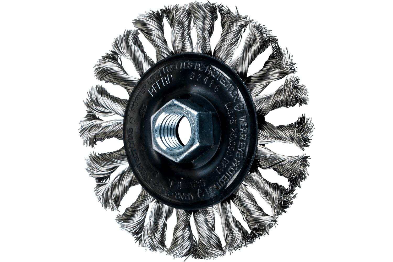 - Arbor Hole Size:5/8-11Attachment Type:Threaded ArborBrush Diameter:4 inFace Width:3/8 inFilament/Wire Diameter:0.014 inFilament/Wire Type:Full Cable Twist KnotFill Material:Stainless SteelMaximum Speed:20000 rpmTrim Length:3/4 in