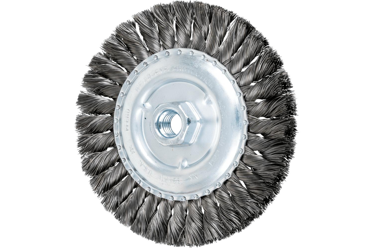 PFERD Wheel Brush, 6 in Brush Dia, 5/8 in Face Width, 5/8-11 Arbor Hole Size, Standard/Twist Knot Filament/Wire Type, 0.014 in Filament/Wire Diameter, Carbon Steel Fill, 1-1/8 in Trim Length, 9000 rpm Maximum, Threaded Arbor Attachment