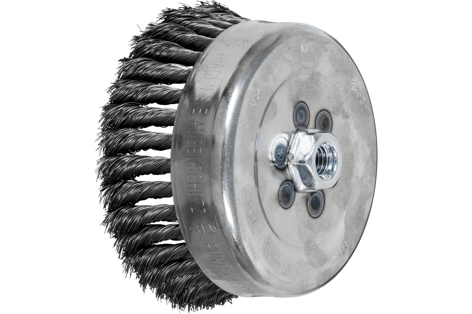 PFERD Cup Brush, External Nut Single Row, 6 in Brush Dia, 5/8-11 Arbor Hole Size, Standard/Twist Knot Filament/Wire Type, 0.014 in Filament/Wire Diameter, Carbon Steel Fill, 1-1/2 in Trim Length, 6000 rpm Maximum