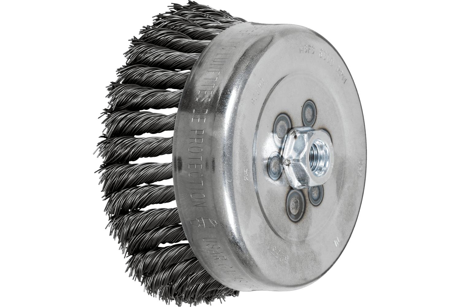 - Arbor Hole Size:5/8-11Brush Diameter:6 inFilament/Wire Diameter:0.023 inFilament/Wire Type:Standard/Twist KnotFill Material:Carbon SteelMaximum Speed:6000 rpmTrim Length:1-1/2 inType:External Nut Single Row