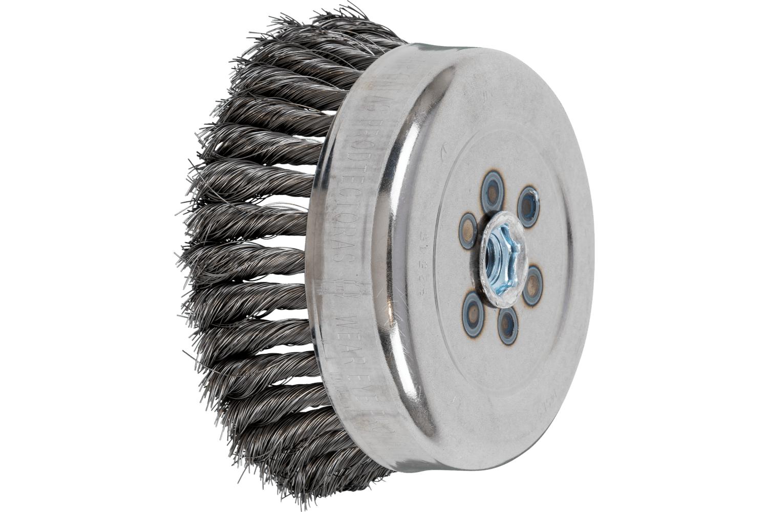 PFERD Cup Brush, Internal Nut Single Row, 6 in Brush Dia, 5/8-11 Arbor Hole Size, Standard/Twist Knot Filament/Wire Type, 0.014 in Filament/Wire Diameter, Carbon Steel Fill, 1-5/8 in Trim Length, 6000 rpm Maximum