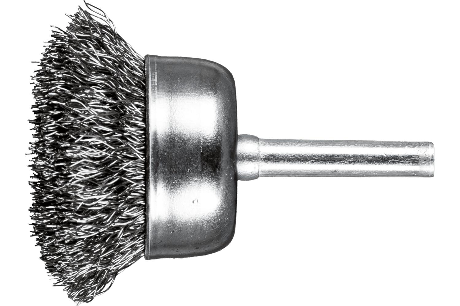 PFERD Cup Brush, Stem Mounted, 1-3/4 in Brush Dia, Crimped Filament/Wire Type, 0.012 in Filament/Wire Diameter, Stainless Steel Fill, 11/16 in Trim Length, 13000 rpm Maximum, 1/4 in Shank Dia