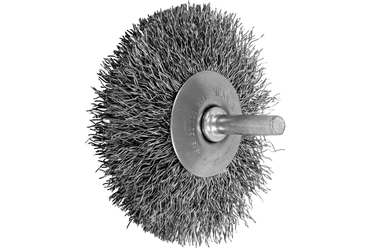 - Brush Diameter:3 inFilament/Wire Diameter:0.014 inFilament/Wire Type:Crimped/FlaredFill Material:Stainless SteelMaximum Speed:20000 rpmShank Diameter:1/4 inTrim Length:7/8 inType:Bevel Stem Mounted
