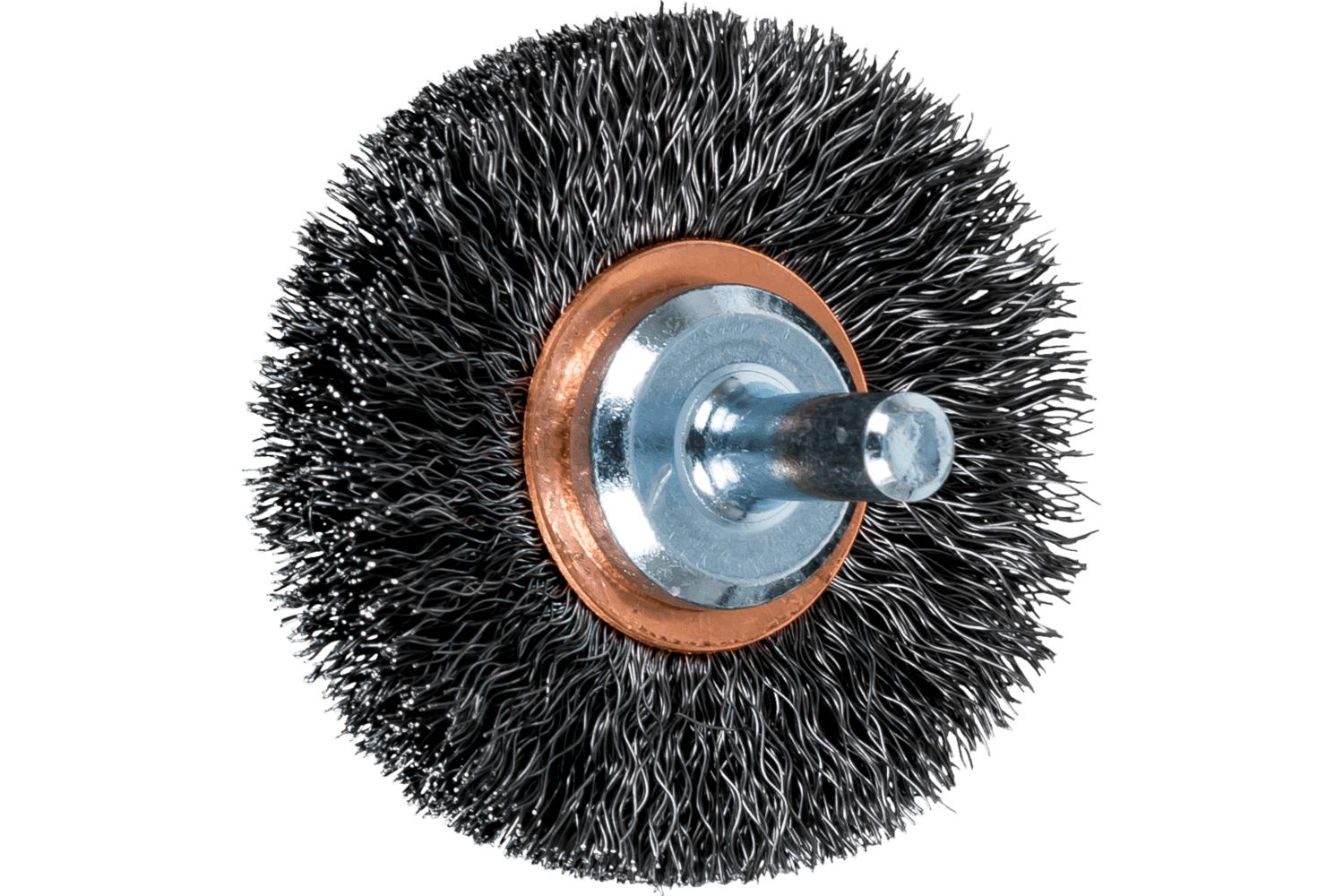 PFERD Wheel Brush, 2 in Brush Dia, 3/8 in Face Width, Crimped Filament/Wire Type, 0.008 in Filament/Wire Diameter, Carbon Steel Fill, 1/2 in Trim Length, 20000 rpm Maximum, Stem Attachment, 1/4 in Shank Dia