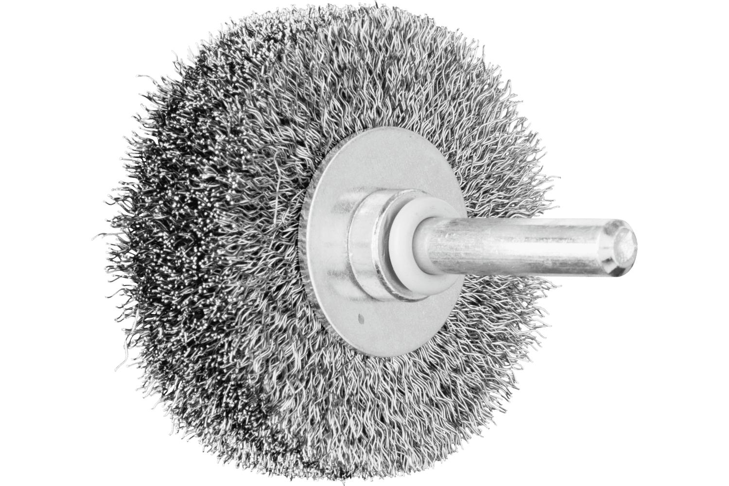 PFERD Wheel Brush, 2 in Brush Dia, 5/8 in Face Width, Crimped Filament/Wire Type, 0.008 in Filament/Wire Diameter, Carbon Steel Fill, 1/2 in Trim Length, 20000 rpm Maximum, Stem Attachment, 1/4 in Shank Dia