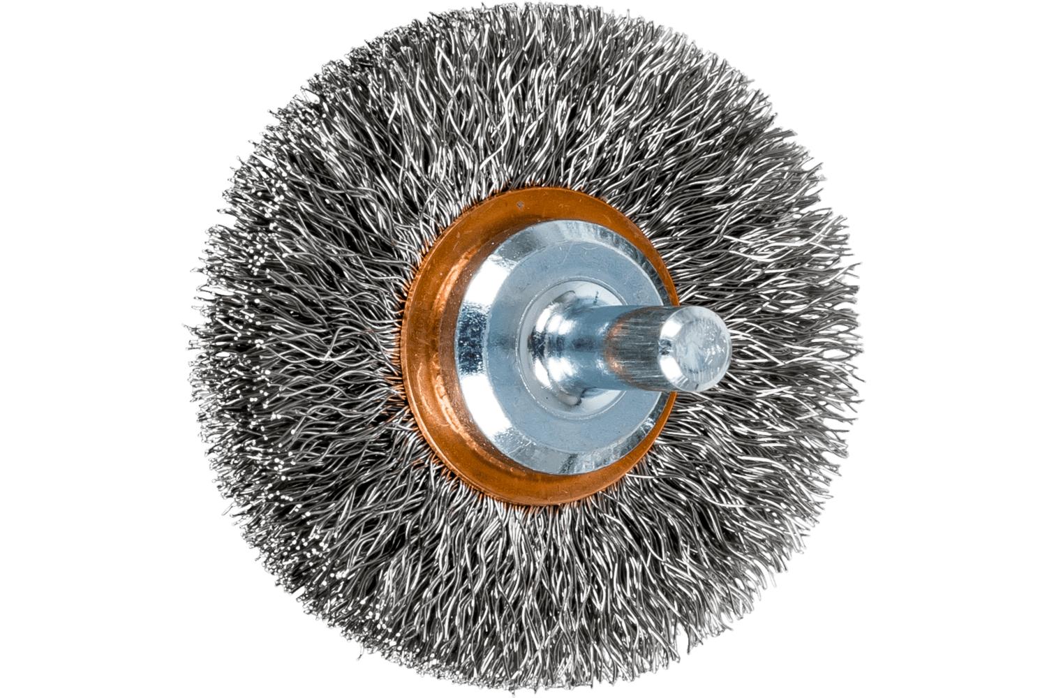 PFERD Wheel Brush, 2 in Brush Dia, 3/8 in Face Width, Crimped Filament/Wire Type, 0.008 in Filament/Wire Diameter, Stainless Steel Fill, 1/2 in Trim Length, 20000 rpm Maximum, Stem Attachment, 1/4 in Shank Dia