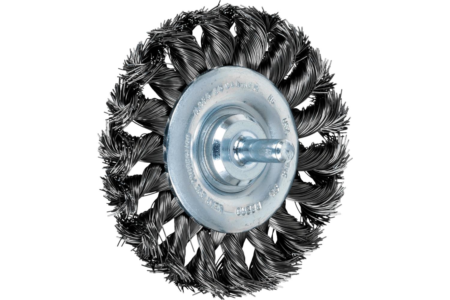 PFERD Wheel Brush, 3 in Brush Dia, 7/16 in Face Width, Standard/Twist Knot Filament/Wire Type, 0.012 in Filament/Wire Diameter, Carbon Steel Fill, 3/4 in Trim Length, 25000 rpm Maximum, Stem Attachment, 1/4 in Shank Dia