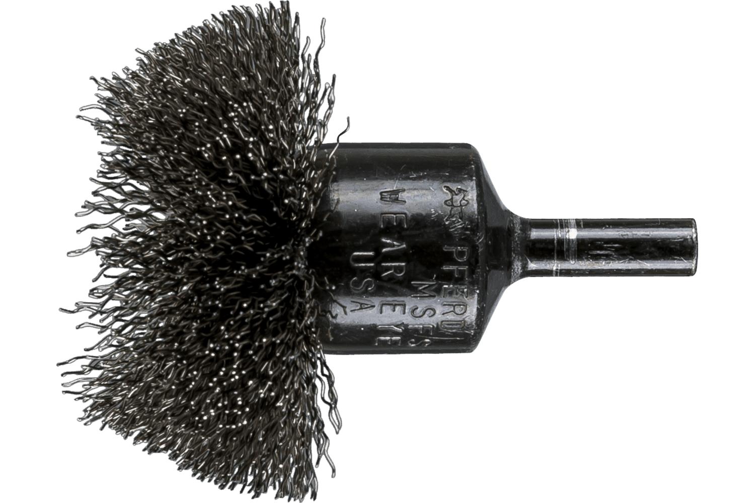 PFERD End Brush, Circular Stem Mount, 2 in Diameter Brush, 1/4 in Shank Diameter, Crimped Filament/Wire Type, 0.01 in Filament/Wire Diameter, Stainless Steel Fill, 14000 rpm Maximum