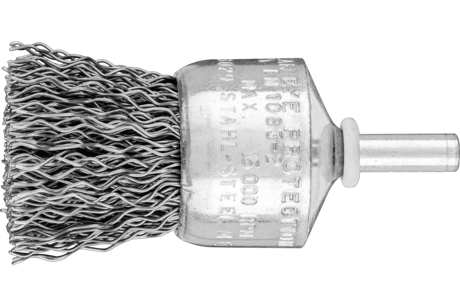 PFERD End Brush, General Purpose Stem Mount, 1 in Diameter Brush, 1/4 in Shank Diameter, Crimped Filament/Wire Type, 0.02 in Filament/Wire Diameter, Carbon Steel Fill, 1 in Trim Length, 20000 rpm Maximum