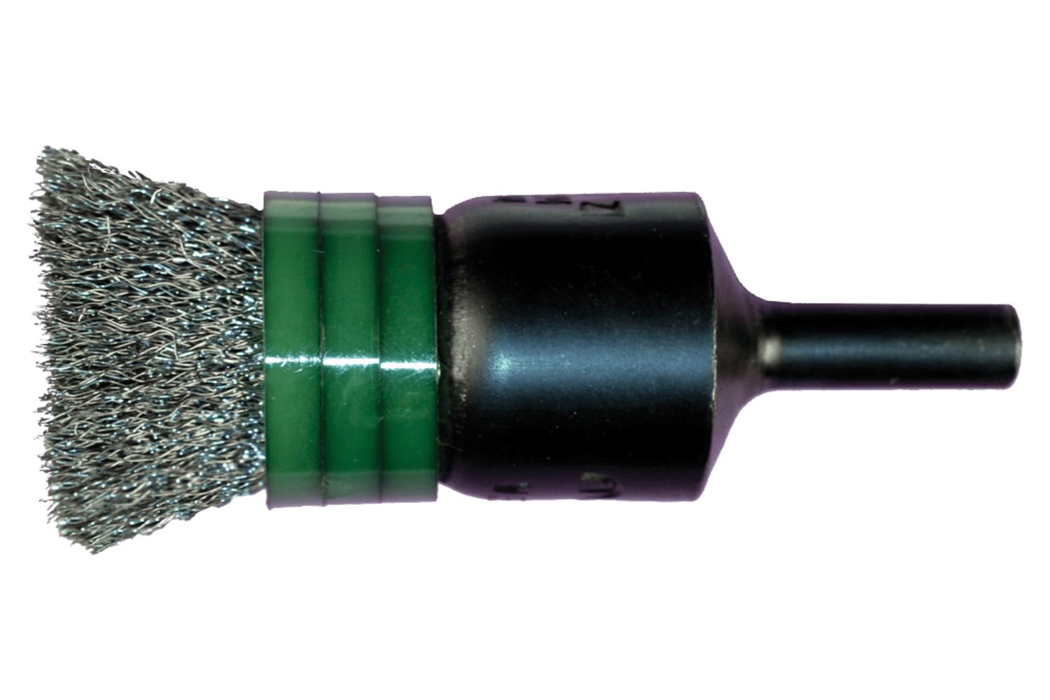 PFERD End Brush, Bridled Stem Mount, 1 in Diameter Brush, 1/4 in Shank Diameter, Banded/Crimped Filament/Wire Type, 0.006 in Filament/Wire Diameter, Carbon Steel Fill, 5/8 in, 1 in Trim Length, 12500 rpm Maximum