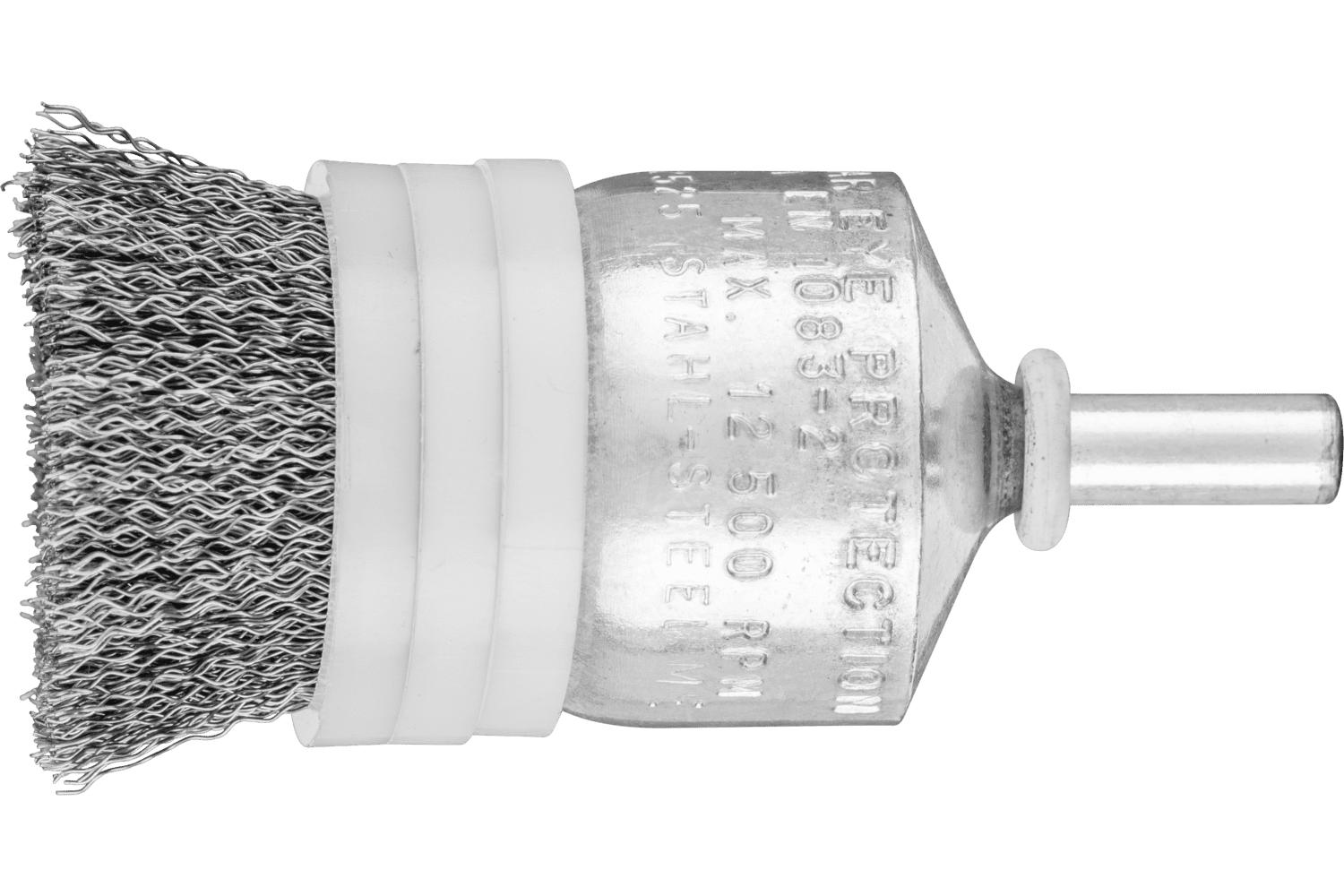PFERD End Brush, Bridled Stem Mount, 1 in Diameter Brush, 1/4 in Shank Diameter, Banded/Crimped Filament/Wire Type, 0.008 in Filament/Wire Diameter, Carbon Steel Fill, 5/8 in, 1 in Trim Length, 12500 rpm Maximum