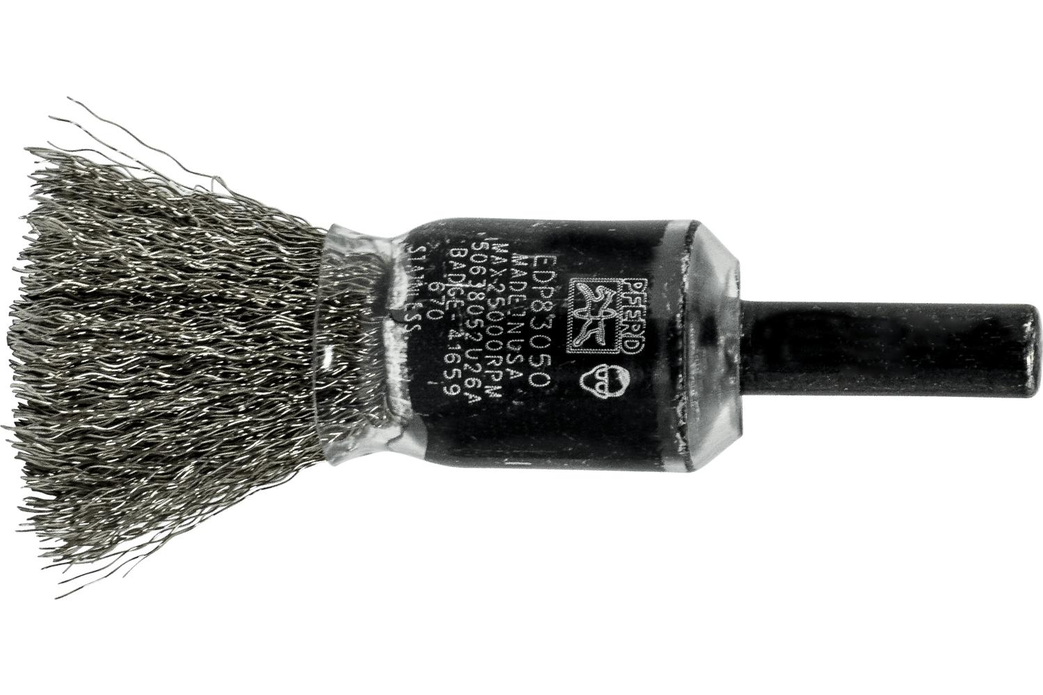 PFERD End Brush, Coated Cup, 1/2 in Diameter Brush, 1/4 in Shank Diameter, Crimped Filament/Wire Type, 0.006 in Filament/Wire Diameter, Stainless Steel Fill, 1 in Trim Length, 25000 rpm Maximum