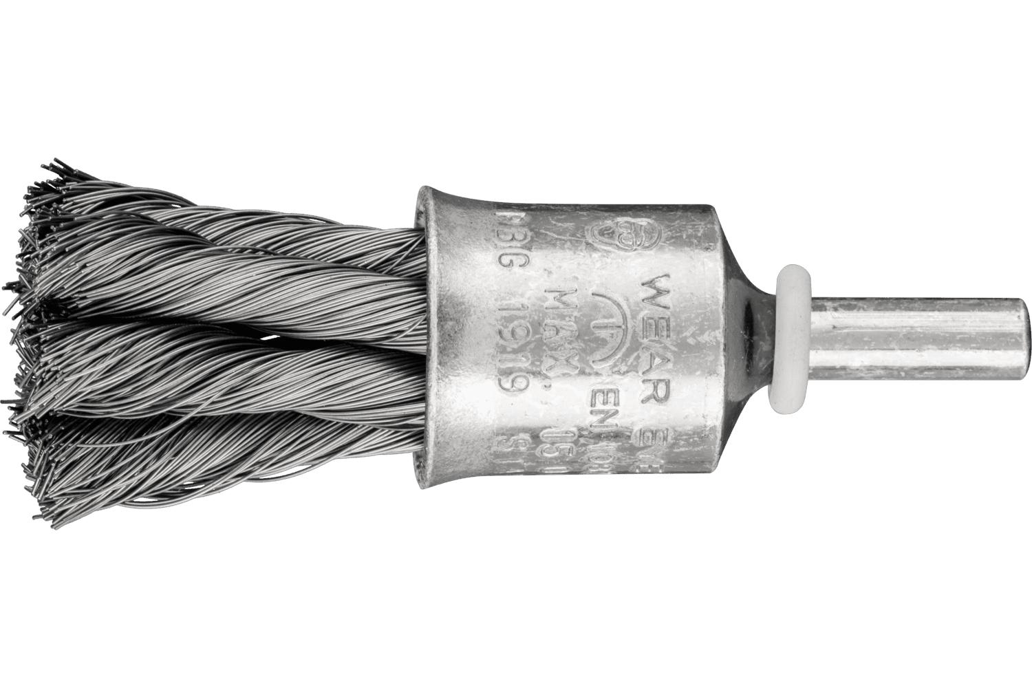 PFERD End Brush, Flared Cup Stem Mount, 1/2 in Diameter Brush, 1/4 in Shank Diameter, Knot Filament/Wire Type, 0.01 in Filament/Wire Diameter, Carbon Steel Fill, 1 in Trim Length, 20000 rpm Maximum
