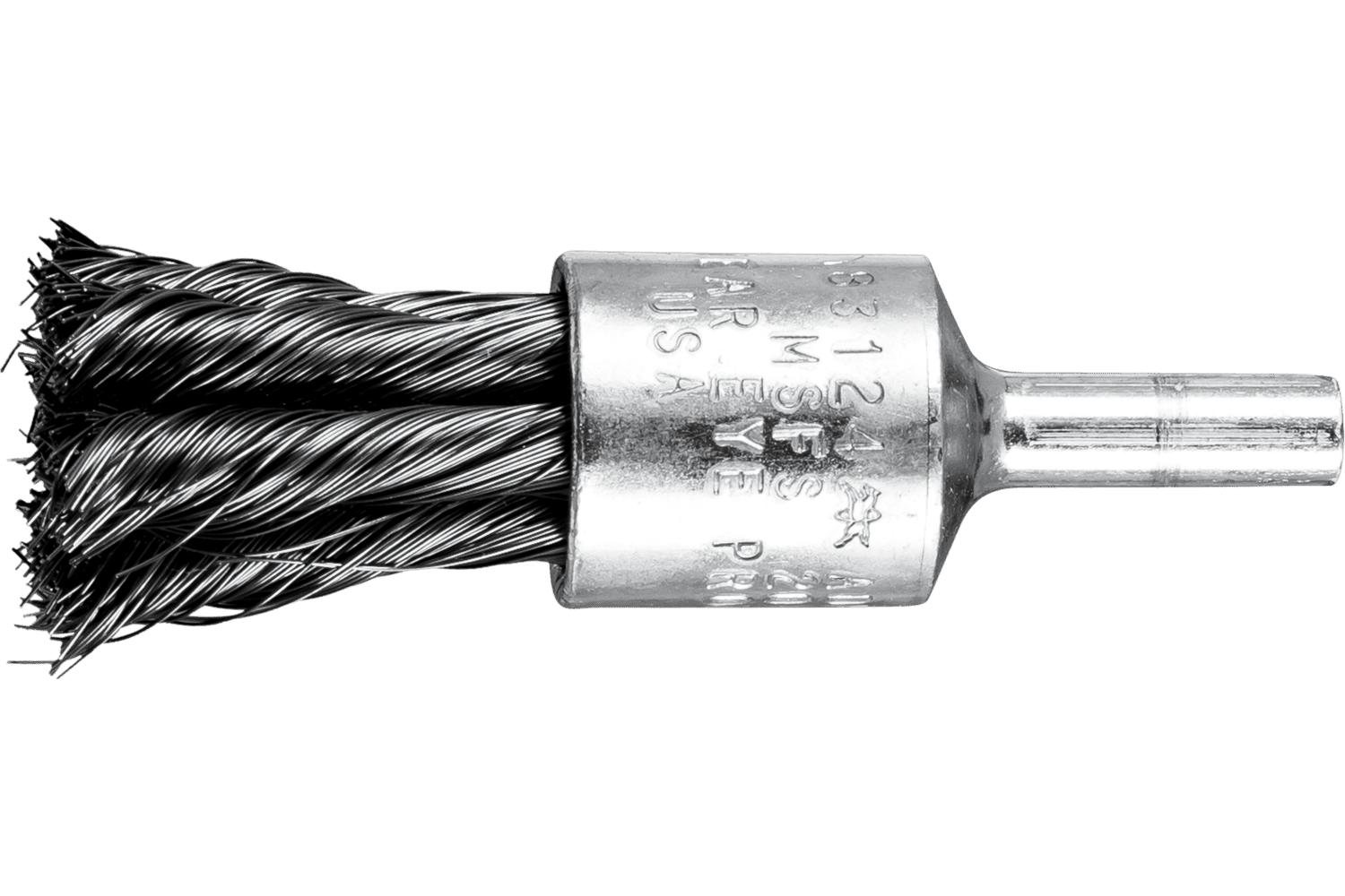 PFERD End Brush, Straight Cup Stem Mount, 1/2 in Diameter Brush, 1/4 in Shank Diameter, Knot Filament/Wire Type, 0.01 in Filament/Wire Diameter, Carbon Steel Fill, 1-1/8 in Trim Length, 20000 rpm Maximum