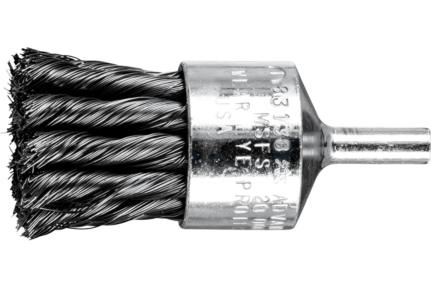PFERD End Brush, Straight Cup Stem Mount, 1 in Diameter Brush, 1/4 in Shank Diameter, Knot Filament/Wire Type, 0.01 in Filament/Wire Diameter, Carbon Steel Fill, 1-1/8 in Trim Length, 20000 rpm Maximum