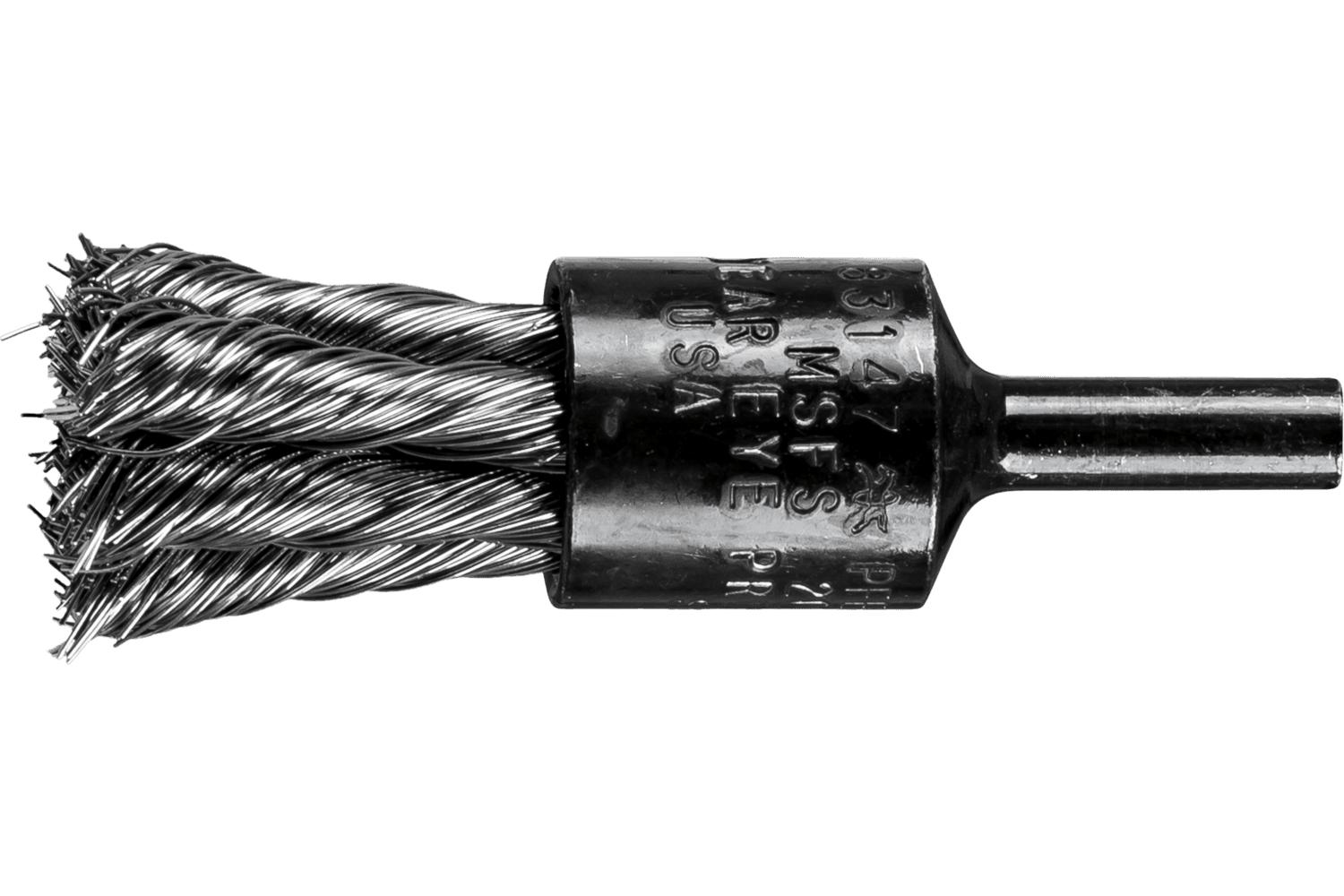 PFERD End Brush, Straight Cup Stem Mount, 1/2 in Diameter Brush, 1/4 in Shank Diameter, Knot Filament/Wire Type, 0.014 in Filament/Wire Diameter, Stainless Steel Fill, 1-1/8 in Trim Length, 20000 rpm Maximum