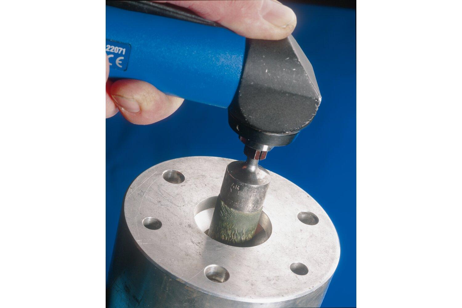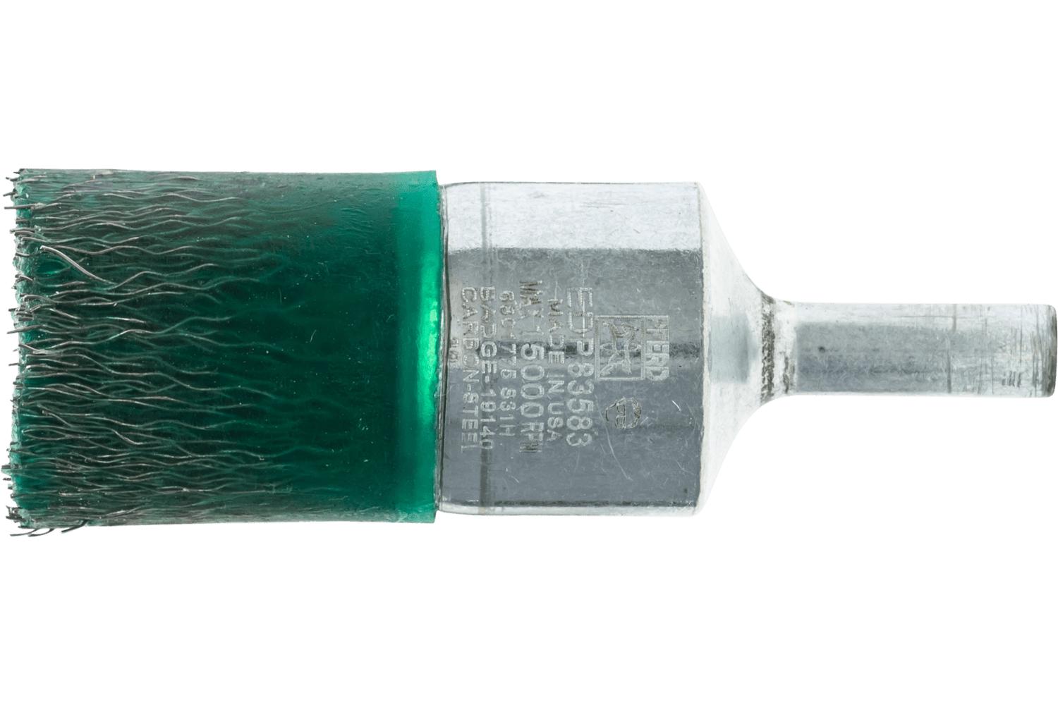PFERD Encapsulated End Brush, Bridled Hollow Center Stem Mount, 1 in Diameter Brush, 1/4 in Shank Diameter, Crimped Filament/Wire Type, 0.01 in Filament/Wire Diameter, Carbon Steel Fill, 7/8 in Trim Length, 13000 rpm Maximum
