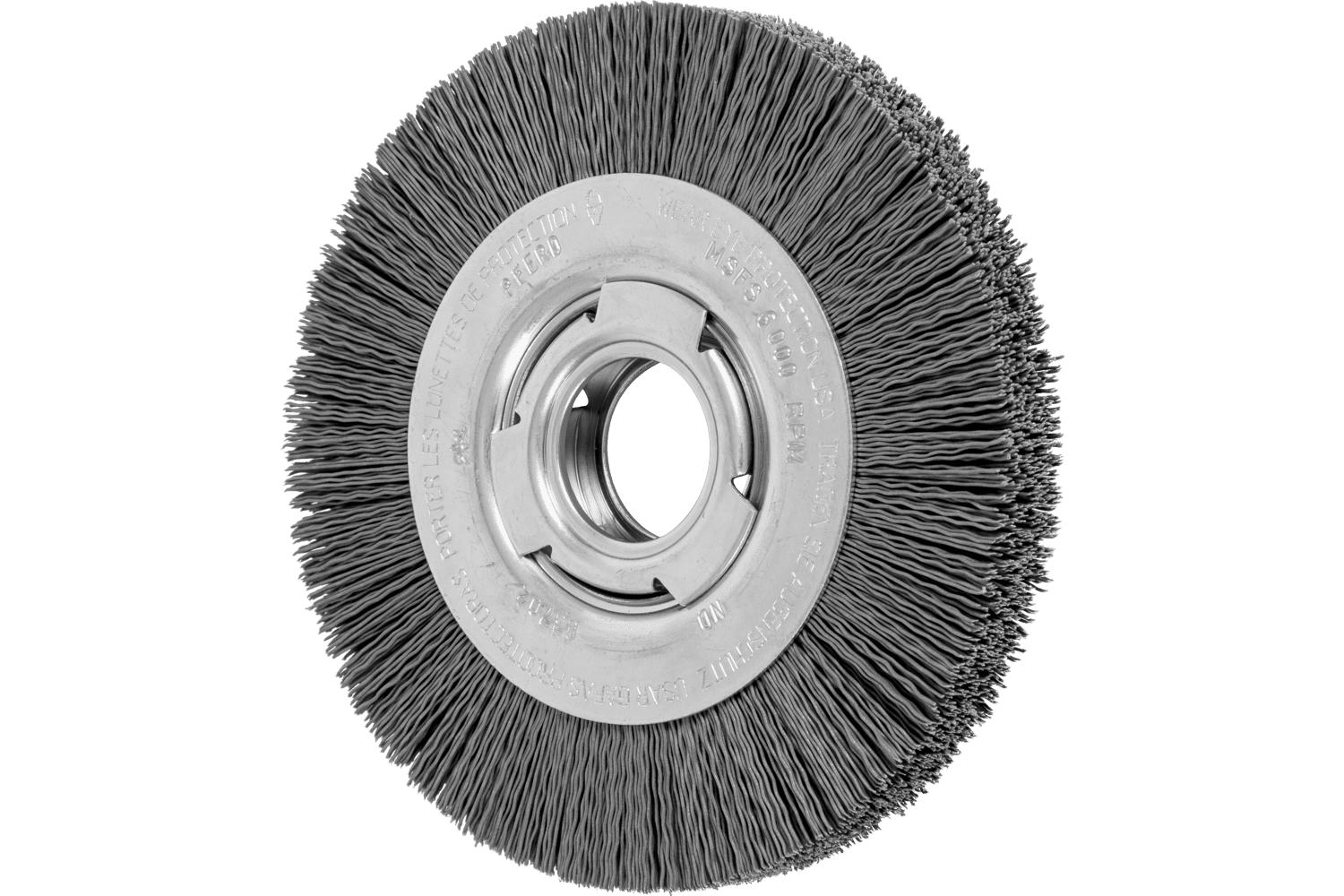 PFERD M-BRAD™ Wheel Brush, Wide Face, 6 in Brush Dia, 7/8 in Face Width, 2 in Arbor Hole Size, 0.022 in Filament/Wire Diameter, Nylon/Silicon Carbide Fill, 1-1/8 in Trim Length, 6000 rpm Maximum, Arbor Attachment
