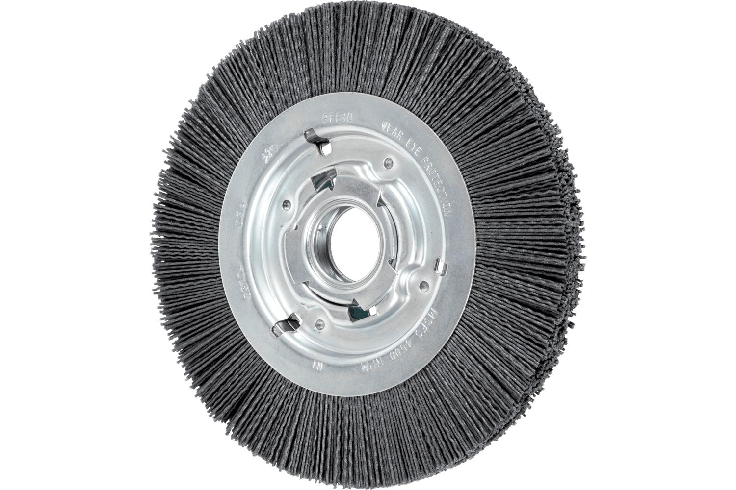 PFERD M-BRAD™ Wheel Brush, Wide Face, 8 in Brush Dia, 1 in Face Width, 2 in Arbor Hole Size, 0.04 in Filament/Wire Diameter, Nylon/Silicon Carbide Fill, 1-1/2 in Trim Length, 4500 rpm Maximum, Arbor Attachment