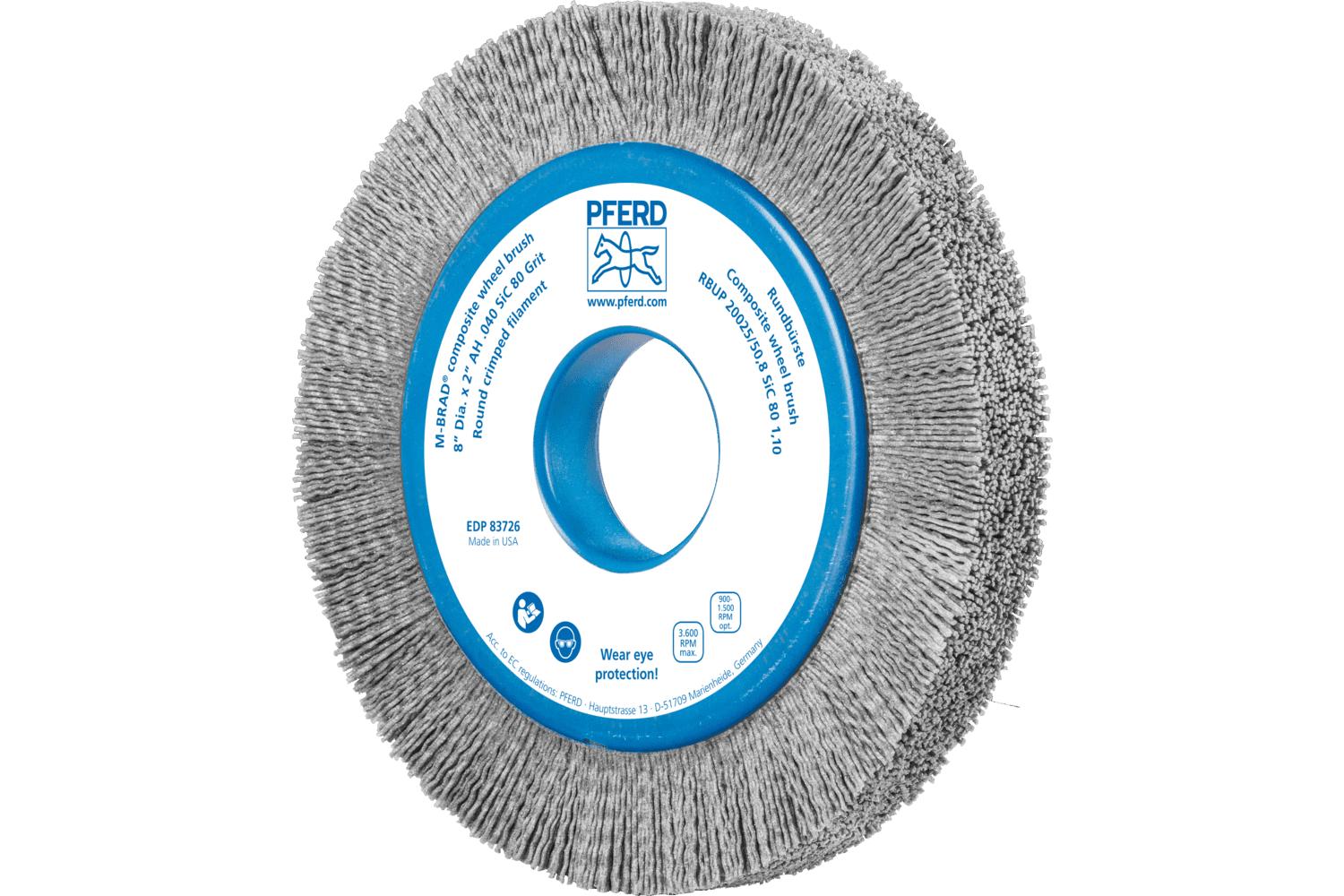 - Arbor Hole Size:2 inAttachment Type:ArborBrush Diameter:8 inFace Width:1 inFilament/Wire Diameter:0.04 inFilament/Wire Type:Crimped/RoundFill Material:Nylon/Silicon CarbideMaximum Speed:3600 rpmTrim Length:1-1/4 inType:Composite Wide Face