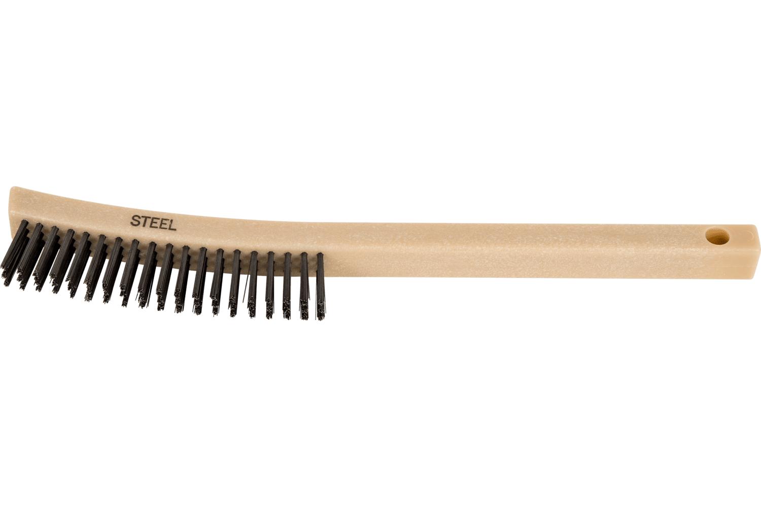 PFERD Scratch Brush, 6-1/4 in Brush, 13-3/4 in L x 7/8 in W Block, 1-1/8 in Trim Length, Carbon Steel Trim, 3 x 19 Rows, Curved Handle, Synthetic Handle