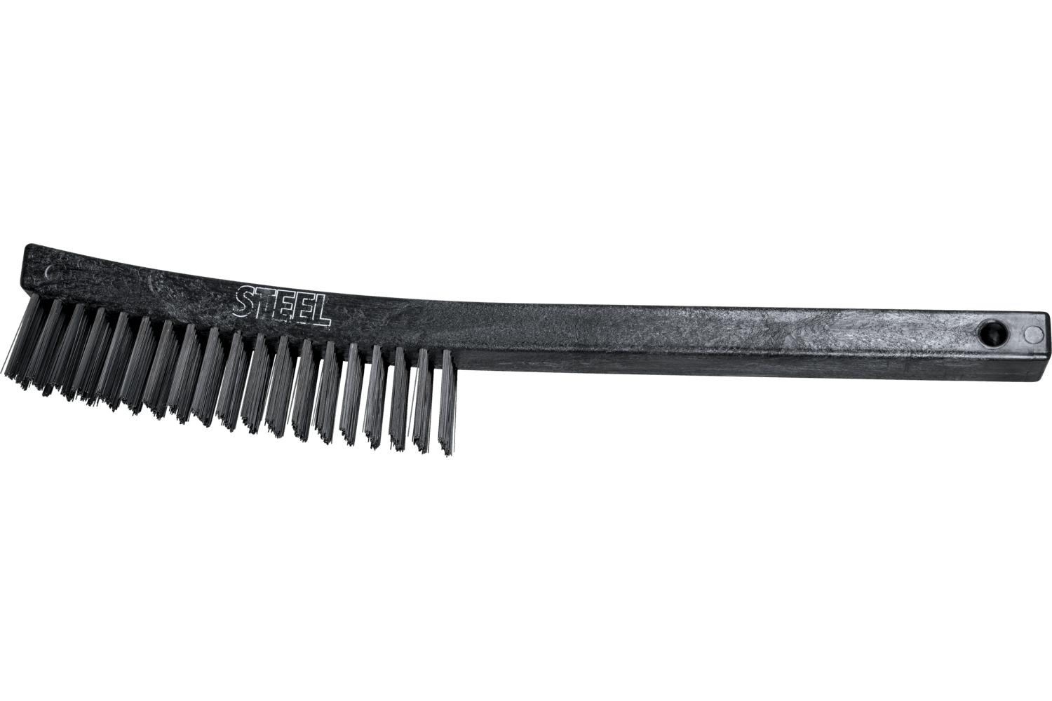 PFERD Scratch Brush, 6-1/4 in Brush, Synthetic Block, 13-3/4 in L x 1-1/8 in W Block, 1-3/16 in Trim Length, Carbon Steel Trim, 4 x 19 Rows, Curved Handle, Synthetic Handle, 13-3/4 in Overall Length