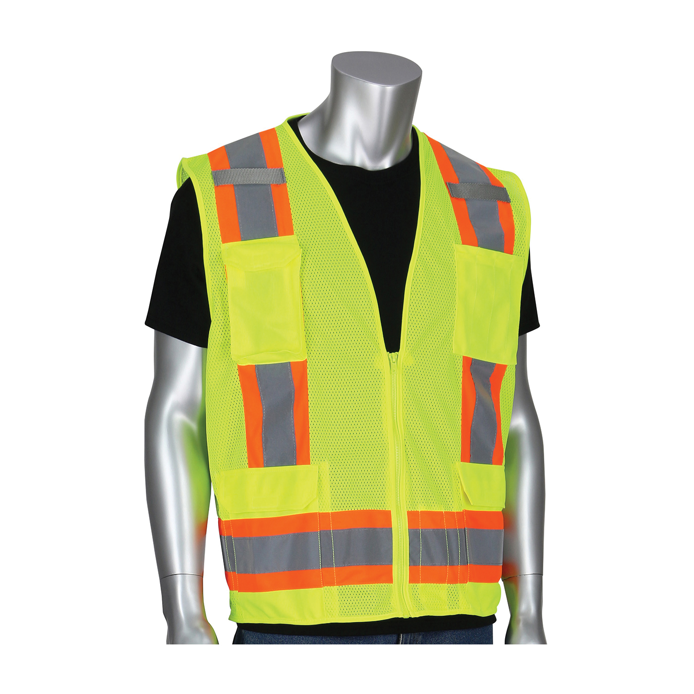 PIP 302-0500M-LY/S 2-Tone Surveyor Safety Vest S Hi-Viz Lime Yellow Polyester Zipper Closure 11 Pockets ANSI Class: Class 2 Specifications Met: ANSI 107 Type R