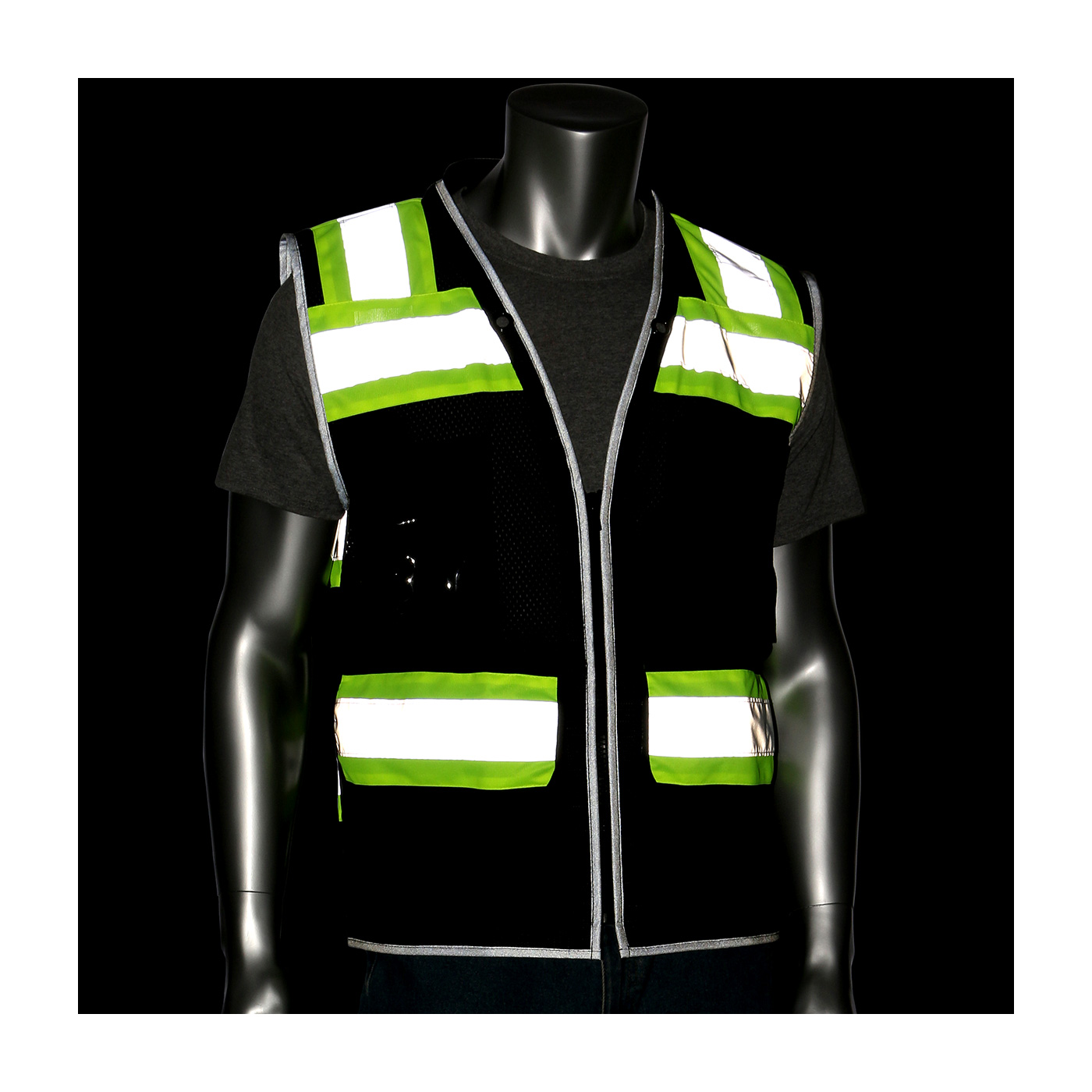 PIP 302-0800D-BK/4X 2-Tone High Visibility Tech-Ready Surveyors Vest With 150D Oxford Black Ripstop and D-Ring Access 4XL Black Polyester Mesh Zipper Closure 15 Pockets ANSI Class: Class 1 ANSI 107 Class 1 Type O1