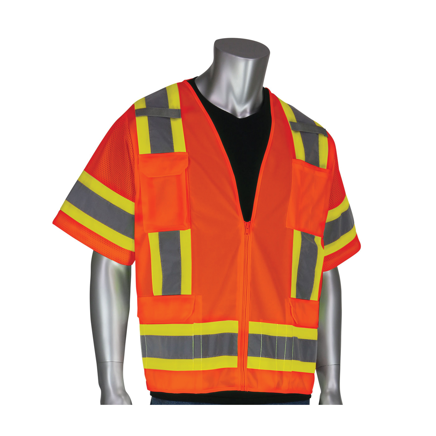 PIP 303-0500-OR/S 2-Tone Surveyor Safety Vest S Hi-Viz Orange Polyester Mesh/Solid Tricot Zipper Closure 11 Pockets ANSI Class: Class 3 Specifications Met: ANSI 107 Type R