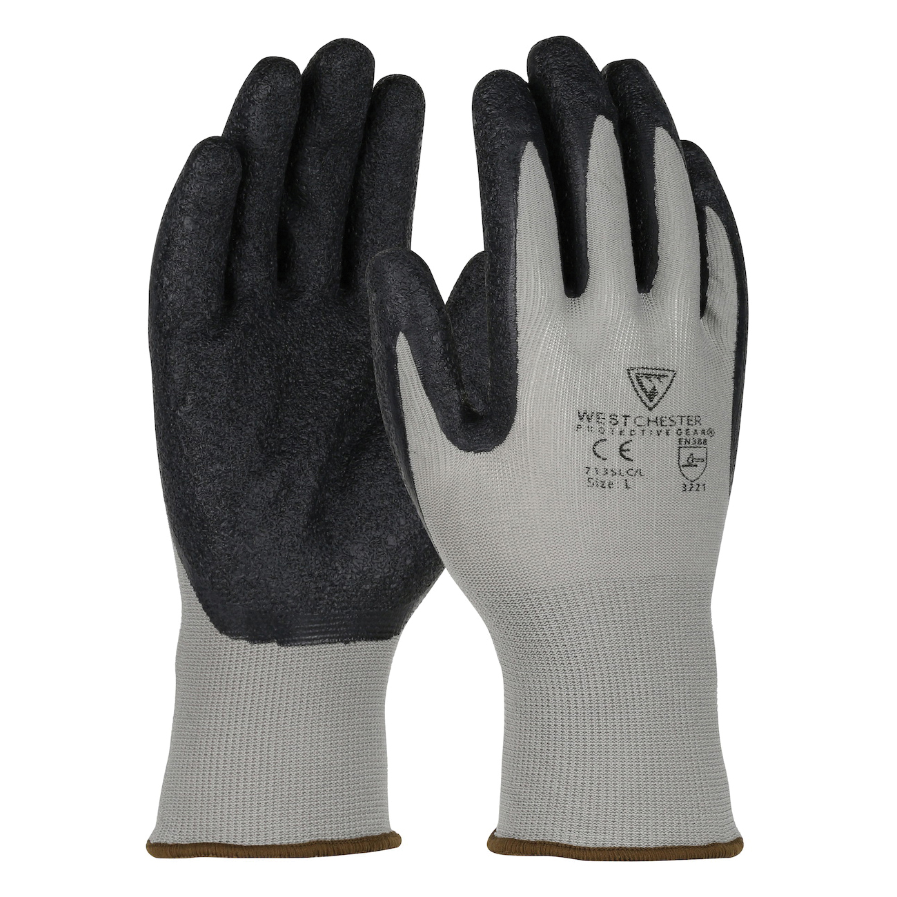 - Coating:LatexCoating Coverage:PalmColor:Black/GrayCuff Style:Knit WristGlove Type:WorkLength:10-5/8 inLining:NylonMaterial:13 ga NylonPalm Material:LatexSeries:713SLCSize:XLStyle:SeamlessType:Unisex
